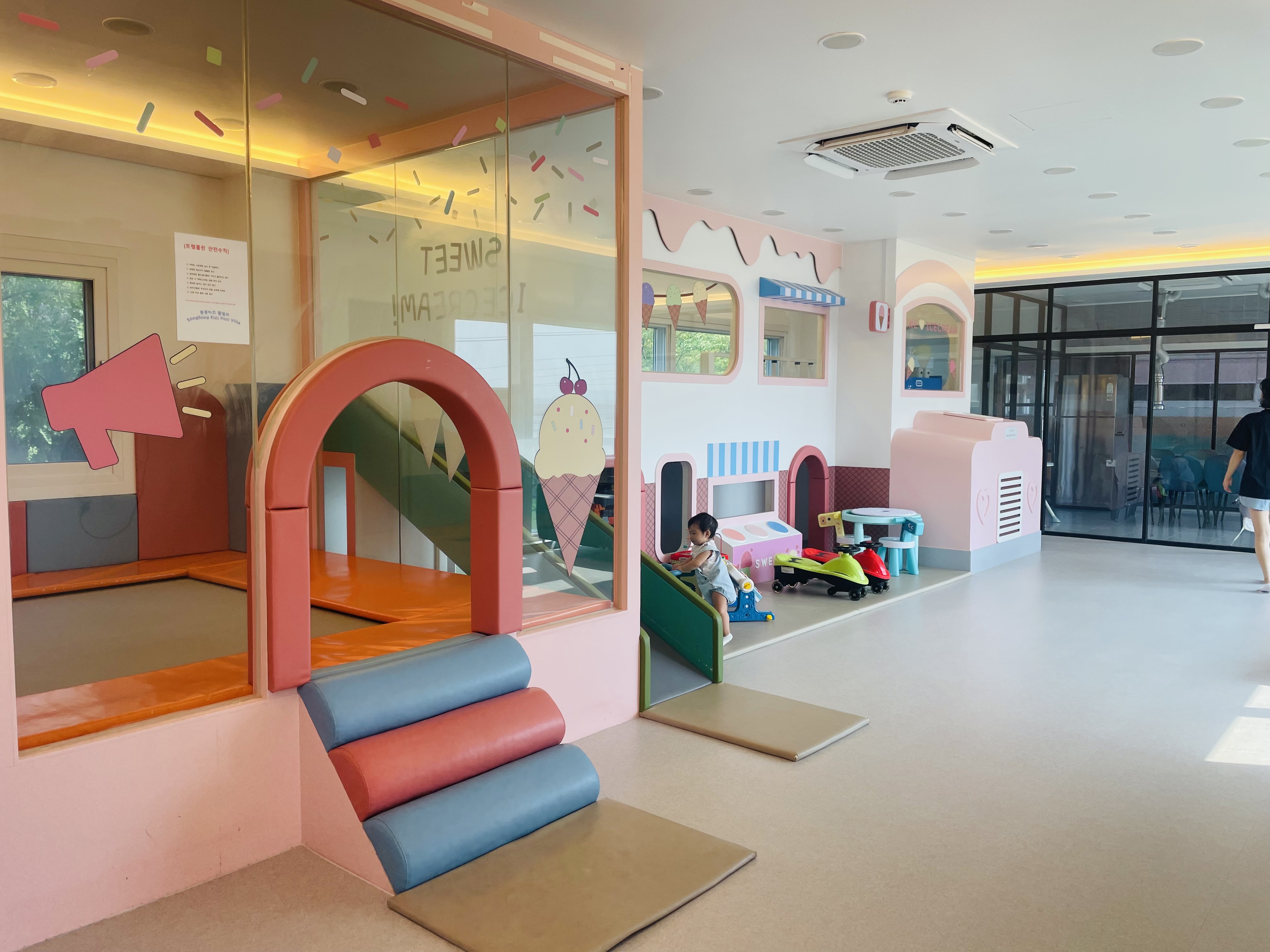 실내 거실 한켠에 안정적으로 설치되어 있었고, 매트도 함께 있어서 아이들이 뛰어놀기에 적당했어요.